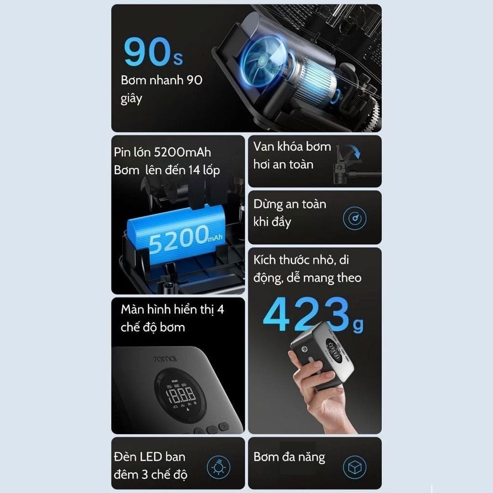 Máy bơm lốp xe cầm tay 70MAI TP07 là trợ thủ đắc lực giúp bạn giải quyết nhanh chóng mọi sự cố về lốp xe, đảm bảo hành trình của bạn luôn an toàn và không bị gián đoạn. Với khả năng bơm nhanh vượt trội, 70MAI chỉ mất khoảng 90 giây để bơm căng lốp xe của bạn và chưa đầy 5 phút để bơm đầy một lốp xe bị xì hoàn toàn. Sản phẩm này không chỉ mạnh mẽ mà còn vô cùng bền bỉ, có thể bơm liên tục 14 lốp xe hoặc 3 lốp xe rỗng chỉ sau một lần sạc đầy, lý tưởng cho những chuyến đi dài.