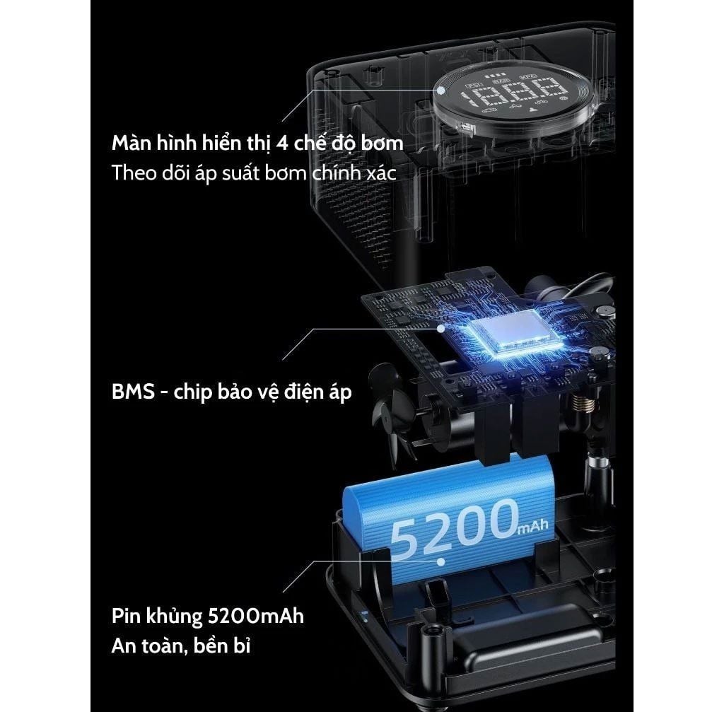 Máy bơm lốp xe cầm tay 70MAI TP07 hoạt động nhờ vào hai viên pin lithium với tổng dung lượng 2600mAh, mang lại hiệu suất mạnh mẽ và bền bỉ. Điểm nổi bật là thiết bị được tích hợp hệ thống quản lý pin BMS, giúp bảo vệ pin khỏi các vấn đề như quá áp, quá nhiệt, đảm bảo an toàn tuyệt đối cho người dùng. Hệ thống này không chỉ kéo dài tuổi thọ pin mà còn giúp máy hoạt động ổn định và hiệu quả hơn trong thời gian dài.