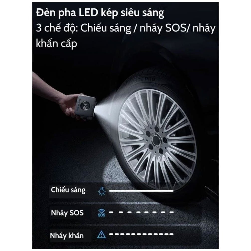 Máy bơm lốp xe cầm tay 70MAI TP07 không chỉ là một thiết bị bơm thông thường mà còn được trang bị tính năng cứu hộ thông minh, giúp bạn xử lý các tình huống khẩn cấp một cách an toàn. Sản phẩm tích hợp hai đèn LED với ba chế độ chiếu sáng linh hoạt: