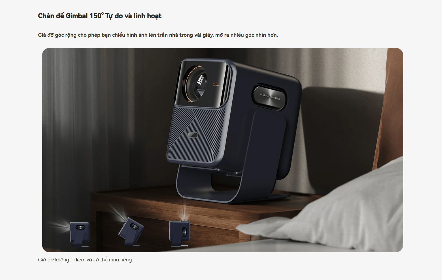 Một trong những điểm nổi bật nhất của Wanbo Mozart 1 Pro 2025 chính là thiết kế chân đế Gimbal sáng tạo, hỗ trợ xoay lên tới 150°. Nhờ đó, bạn có thể dễ dàng chiếu hình ảnh lên trần nhà hoặc điều chỉnh góc chiếu linh hoạt trong không gian hẹp. Đây là giải pháp lý tưởng cho các phòng ngủ, căn hộ nhỏ hoặc không gian giải trí tại gia mà vẫn đảm bảo khung hình lớn, rõ ràng và sinh động.