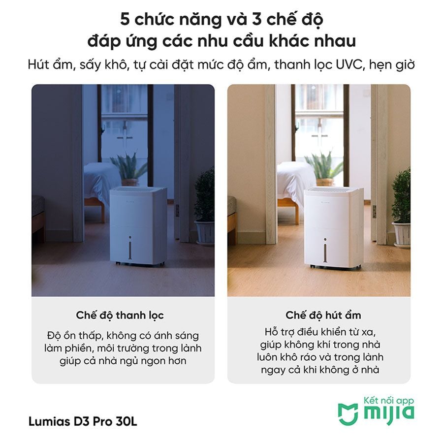 Máy hút ẩm thông minh Lumias D3 Pro là một trợ lý hữu ích cho ngôi nhà trong những ngày trời mưa hay thời tiết nồm ẩm. Máy có công suất lớn 490W, dung tích 30L, hút ẩm trên diện tích lên tới 100m² cùng trang bị nhiều tính năng hiện đại như điều khiển bằng ứng dụng thông minh, hỗ trợ sấy khô quần áo, tính năng khóa trẻ, tự động ngắt khi bị nghiêng… Đặc biệt, Lumias D3 Pro rất phù hợp cho những gia đình có trẻ nhỏ, người già hoặc những người có vấn đề về hô hấp.