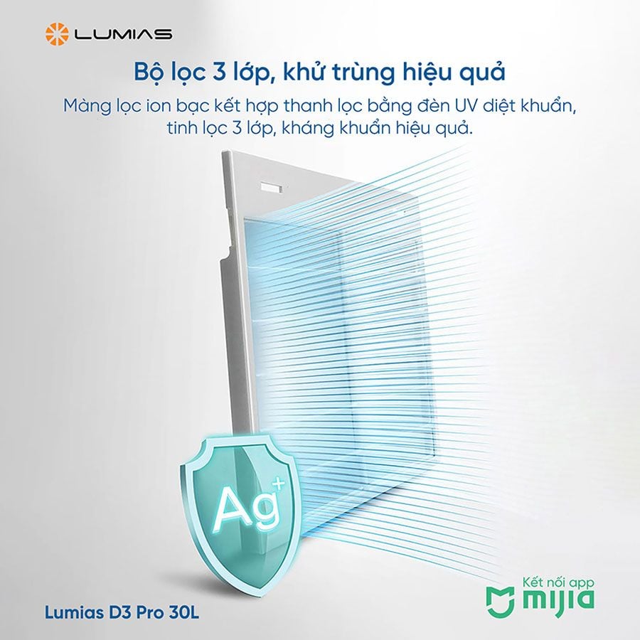 Máy hút ẩm không khí Lumias D3 Pro nổi bật với khả năng hút ẩm vượt trội cùng trang bị công nghệ hiện đại để bảo vệ sức khỏe cho gia đình. Hệ thống máy nén tự động hoạt động êm ái, độ ồn dưới 38.6dB đảm bảo sự yên tĩnh, không làm gián đoạn giấc ngủ hay công việc. Đặc biệt, bộ lọc ion bạc tích hợp có khả năng loại bỏ đến 99% vi khuẩn, nấm mốc, mang đến bầu không khí trong lành, sạch sẽ. Do đó, bạn có thể yên tâm tận hưởng một không gian sống an toàn, đặc biệt Lumias D3 Pro phù hợp với gia đình có trẻ nhỏ và người già.