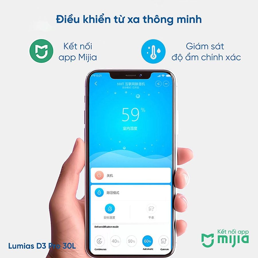 Máy hút ẩm Lumias D3 Pro trang bị bộ điều khiển từ xa qua ứng dụng Mijia. Bạn sẽ dễ dàng thao tác trên điện thoại với đầy đủ tính năng bật/tắt máy, hẹn giờ, theo dõi độ ẩm không khí bất cứ lúc nào… Ngoài ra, bạn còn có thể tạo lịch trình hoạt động tự động ngay cả khi bạn không ở nhà, giúp tiết kiệm tối đa điện năng tiêu thụ. Mijia được thiết lập điều khiển bằng giọng nói qua trợ lý ảo Xiao Ai mang đến trải nghiệm thông minh cho người dùng.