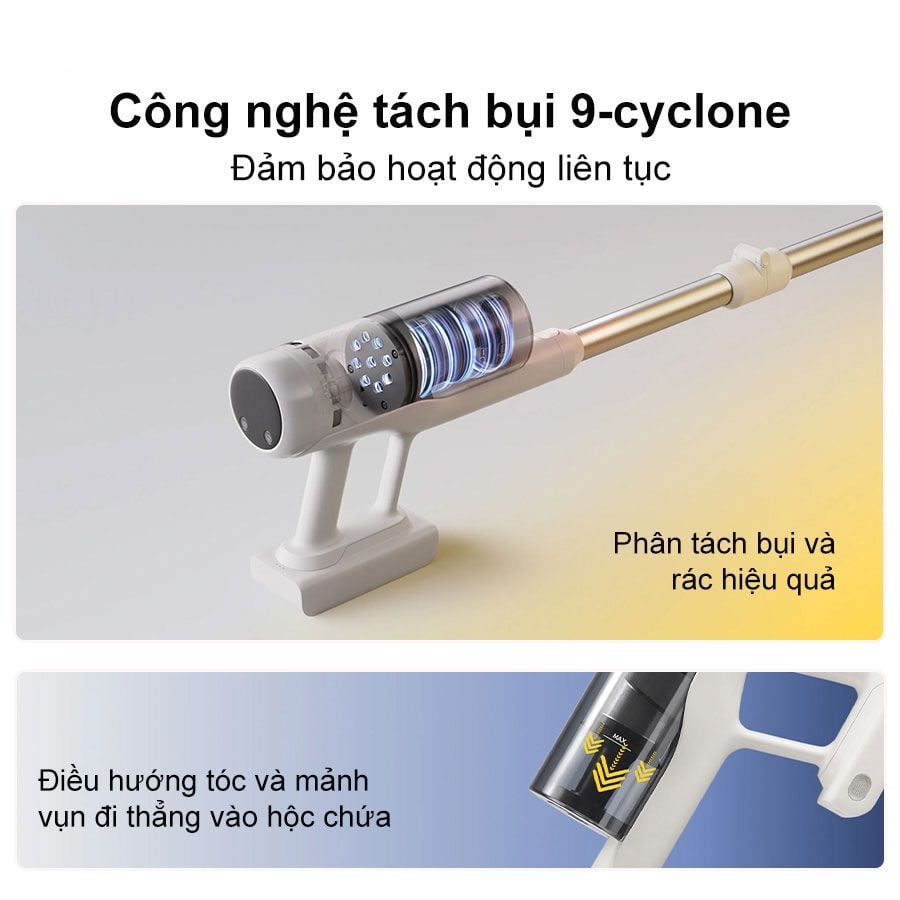 - Hệ thống tách bụi 9-Cyclone duy trì lực hút ổn định