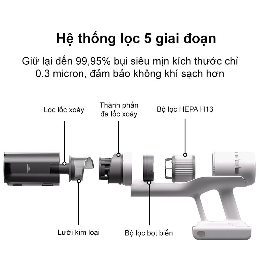 - Hệ thống lọc 5 tầng giữ lại 99.95% hạt bụi siêu mịn