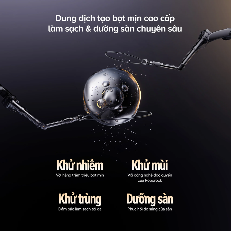 Máy hút bụi lau nhà cầm tay Roborock F25 ACE Pro mở ra kỷ nguyên mới cho công nghệ lau sàn với công nghệ bọt siêu vi năng lượng độc quyền. Hệ thống này kết hợp công nghệ tạo bọt vi mô và dung dịch tẩy rửa chứa amino acid chuyên dụng, giúp tăng gấp 3 lần khả năng làm sạch, khử mùi tới 97% và an toàn tuyệt đối cho người dùng cũng như thú cưng. Mỗi hạt bọt khí siêu nhỏ khi vỡ ra sẽ giải phóng năng lượng tức thì, dễ dàng đánh bật vết bẩn cứng đầu và khử mùi tận gốc mà không cần cọ rửa mạnh tay.