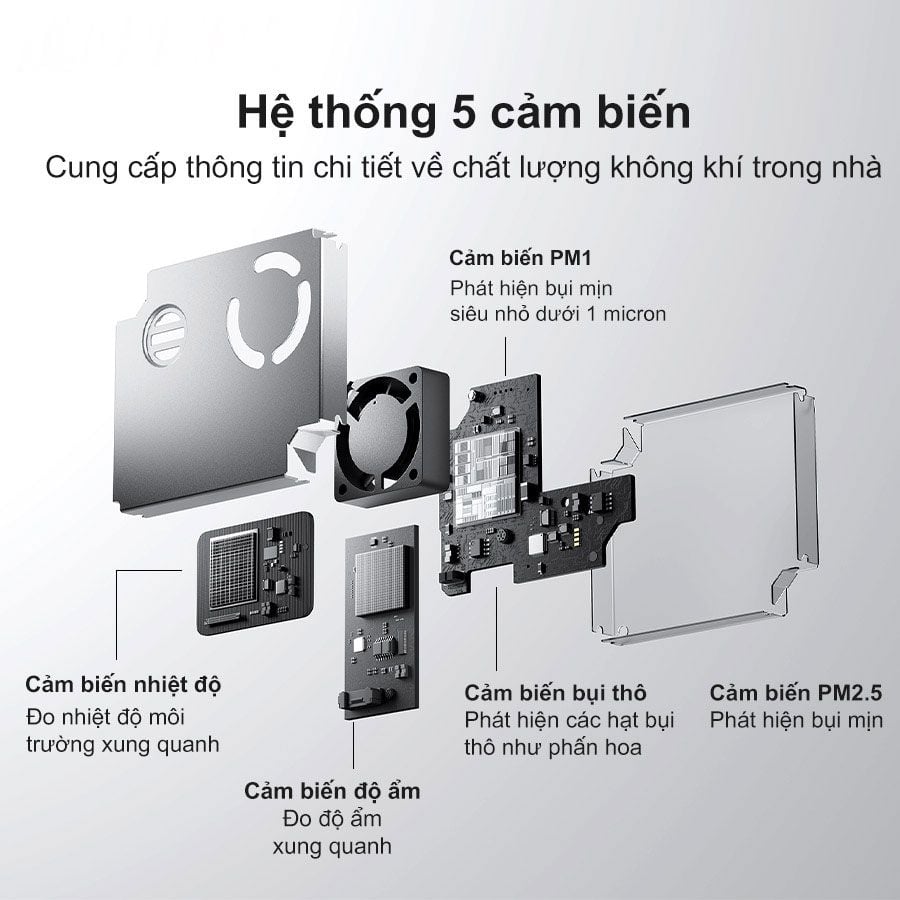 Với sự kết hợp của 5 cảm biến này, thiết bị không chỉ lọc sạch mà còn hiểu rõ chất lượng không khí, từ đó mang đến giải pháp tối ưu cho sức khỏe của cả gia đình.