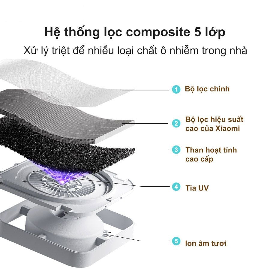 Không chỉ giám sát chất lượng không khí, máy lọc Xiaomi Mijia Smart Air Purifier 6 còn sở hữu công nghệ lọc composite 5 lớp giúp xử lý triệt để nhiều loại chất ô nhiễm trong nhà. Mỗi lớp lọc đảm nhận một vai trò riêng biệt, tạo nên hệ thống bảo vệ toàn diện.