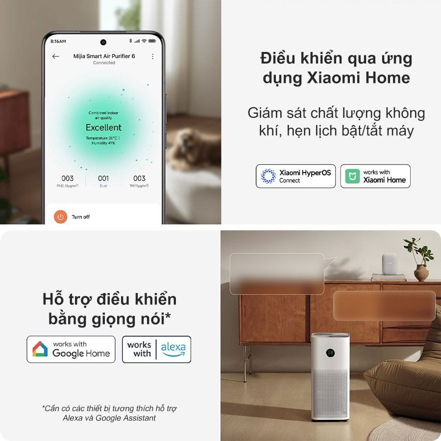 Với ứng dụng Xiaomi Home, người dùng có thể theo dõi chất lượng không khí ngay trên điện thoại, bật/tắt hoặc hẹn lịch vận hành từ xa, đồng thời kiểm tra tuổi thọ bộ lọc để thay thế đúng lúc. Không dừng lại ở đó, thiết bị còn tương thích với Google Assistant và Amazon Alexa, cho phép điều khiển bằng giọng nói chỉ với những câu lệnh đơn giản.