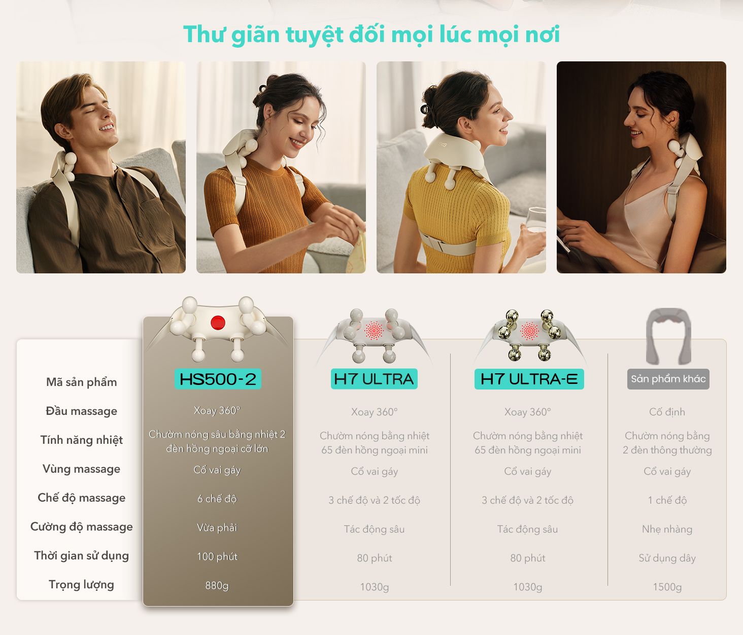 - 6 đầu massage phân bổ đồng đều: Mô phỏng như bàn tay chuyên viên, ôm trọn và xoa bóp vùng cơ nhức mỏi, giúp thư giãn toàn bộ vùng cổ mỏi mệt.