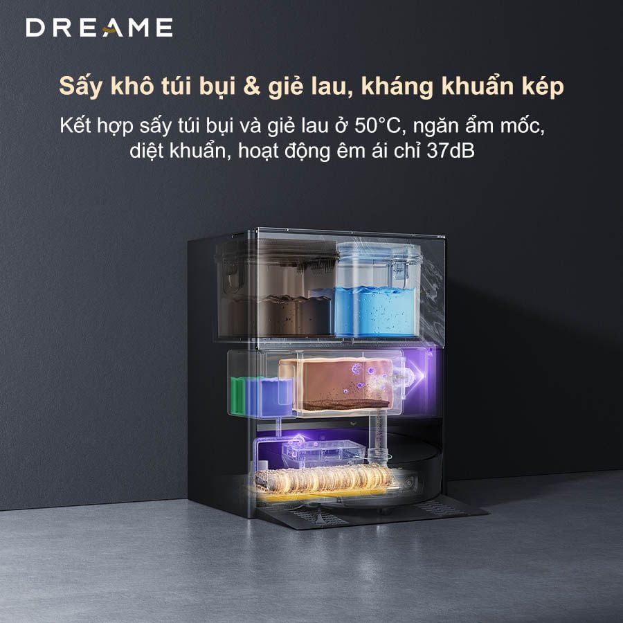 Dock sạc của robot tích hợp hệ thống 100°C ThermoHub™ Self-Cleaning, sử dụng nước nóng 100 độ C để rửa sạch tấm lau và hệ thống bên trong. Cơ chế này giúp loại bỏ vi khuẩn, nấm mốc và mùi hôi hiệu quả, đảm bảo vệ sinh an toàn tuyệt đối.