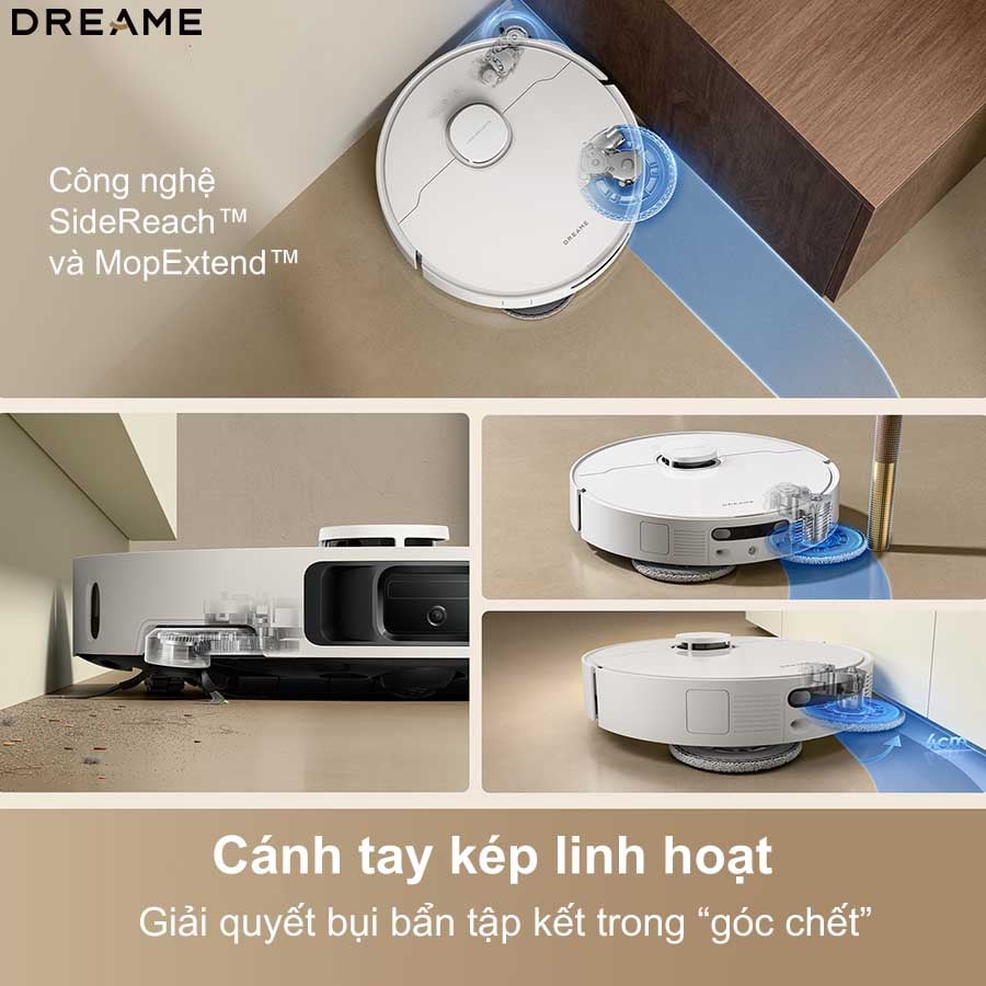 Với sự kết hợp của hai công nghệ tiên tiến SideReach Vacuuming và MopExtend RoboSwing, Dreame L10s Ultra Gen 3 dễ dàng xử lý các vị trí mà robot thông thường khó tiếp cận như góc tường, khe bàn ghế hay mép chân tường cong.