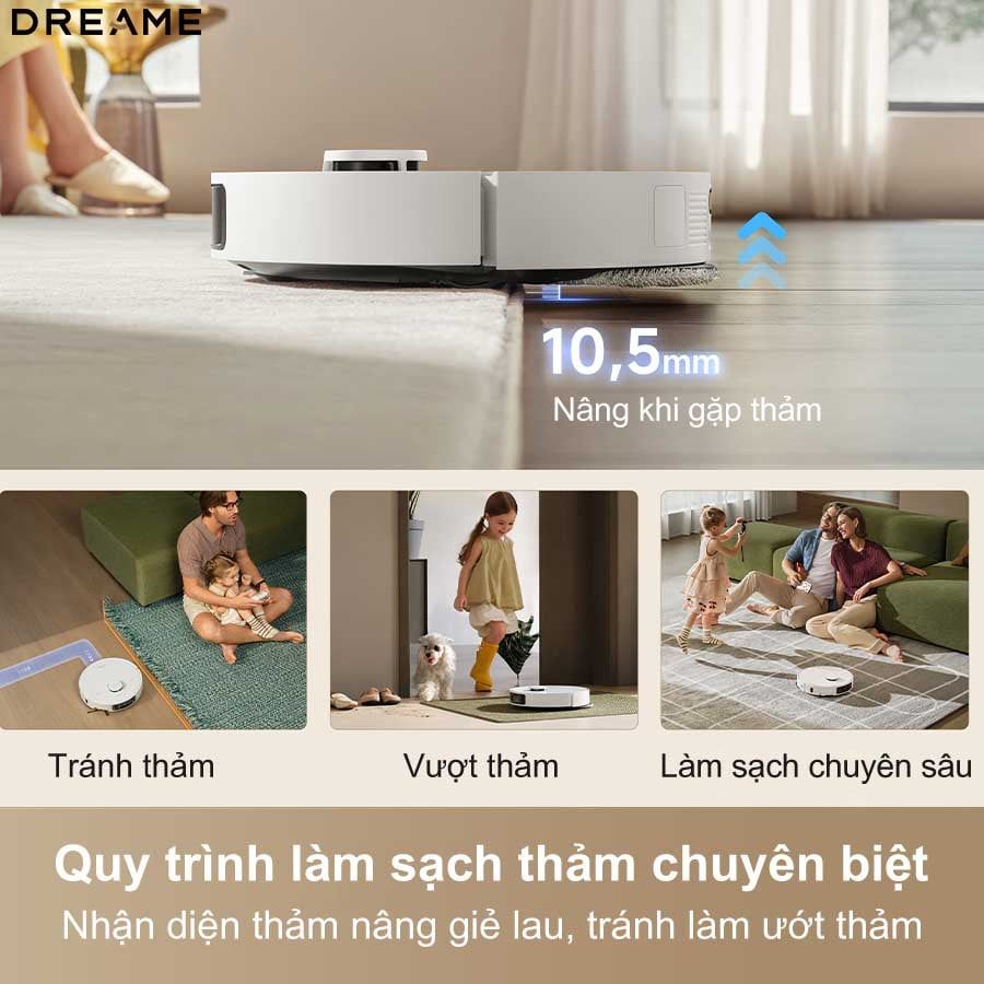 Khi robot phát hiện khu vực có thảm, hệ thống cảm biến sẽ tự động nâng giẻ lau lên cao tới 10,5mm, ngăn nước lan sang và giữ thảm luôn khô ráo. Cơ chế này tương thích với nhiều loại thảm, từ lông ngắn đến lông dài, giúp robot di chuyển linh hoạt giữa các bề mặt mà không cần can thiệp thủ công.