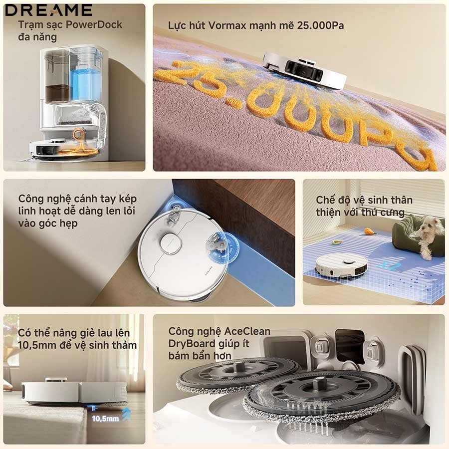 Nhờ hệ thống hút và lau đồng bộ, thiết bị tối ưu hóa hiệu suất làm việc, đảm bảo từng khu vực trong ngôi nhà được làm sạch triệt để mà không cần quay lại hay hỗ trợ thủ công. Người dùng có thể hoàn toàn yên tâm tận hưởng không gian sống sạch sâu, tinh gọn và tiết kiệm tối đa thời gian.