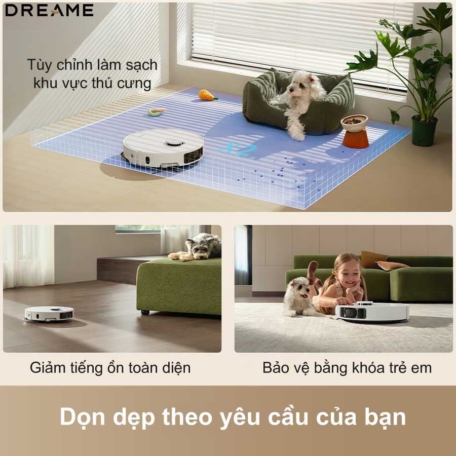 Đồng thời, chế độ giảm ồn toàn diện cùng khóa trẻ em (Child Lock) giúp robot vận hành êm ái, không ảnh hưởng đến giấc ngủ hay hoạt động hàng ngày, đảm bảo môi trường sinh hoạt an toàn, yên tĩnh và dễ chịu cho cả gia đình.