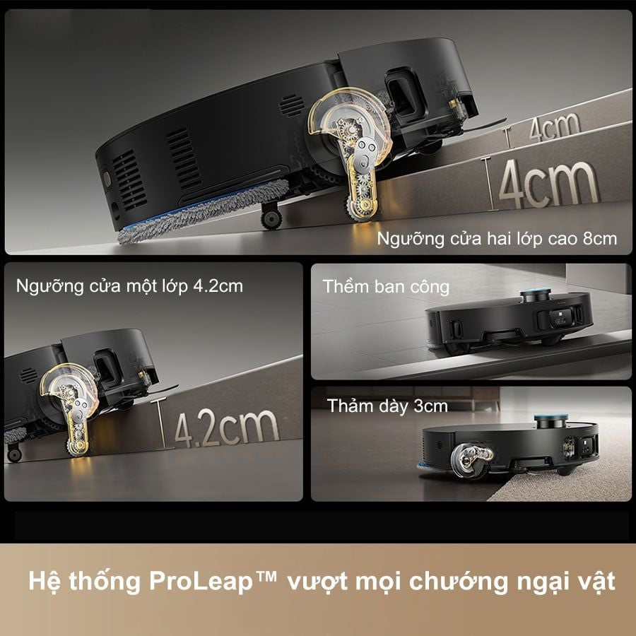 Robot hút bụi lau nhà Dreame Matrix10 Ultra gây ấn tượng khi được trang bị hệ thống ProLeap™ hoàn toàn mới, cho phép robot vượt qua các chướng ngại vật phức tạp như bậc cửa, ray trượt hay đường gờ cao mà nhiều mẫu robot khác không thể. Robot có thể vượt bậc đơn cao tới 4,2cm hoặc bậc kép lên tới 8cm, nhờ sự kết hợp của chân nâng linh hoạt và cánh tay đòn xoay phía trước bánh xe.