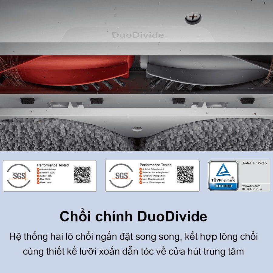 Chổi DuoDivide thiết kế kép với hai con lăn song song và lưỡi dao xoắn ốc giúp gom tóc và rác vào đúng tâm hút. Nhờ cơ chế này, robot tránh được tình trạng tắc nghẽn, đảm bảo duy trì hiệu suất làm việc ổn định trong suốt chu kỳ vệ sinh.
