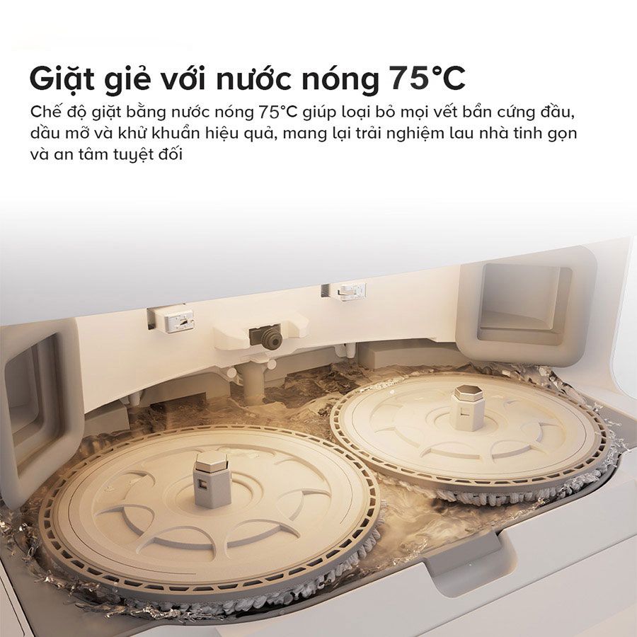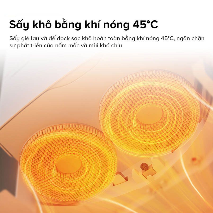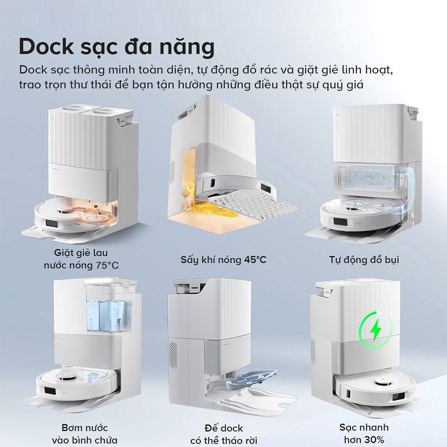 Không chỉ vậy, dock còn có khả năng tự giặt khăn lau bằng nước nóng 75°C với quy trình mô phỏng hoạt động của máy giặt: giặt sơ, xả và vắt khô tốc độ cao. Khăn lau sau đó sẽ được sấy khô bằng khí ấm 45°C, giúp khử mùi, diệt khuẩn và ngăn ngừa ẩm mốc hiệu quả. Tất cả được thực hiện hoàn toàn tự động, giữ cho robot luôn trong tình trạng sạch sẽ, sẵn sàng làm việc bất cứ lúc nào.